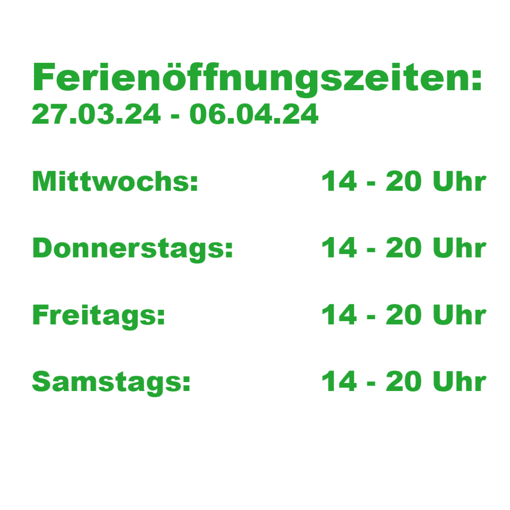 Vom 16.04.-26.04. ist unsere Halle von Mittwoch bis Samstag von 14-20 Uhr für euch geöffnet.