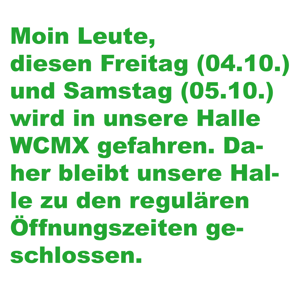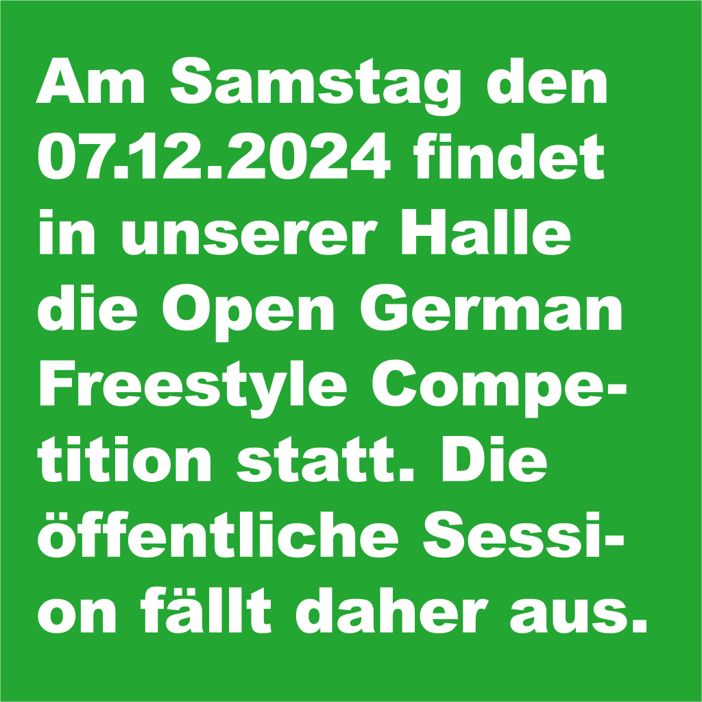Am Samstag (29.11.2025) bleibt unsere Halle aufgrund der darin stattfindenden Parkour-Convention 2025 geschlossen.