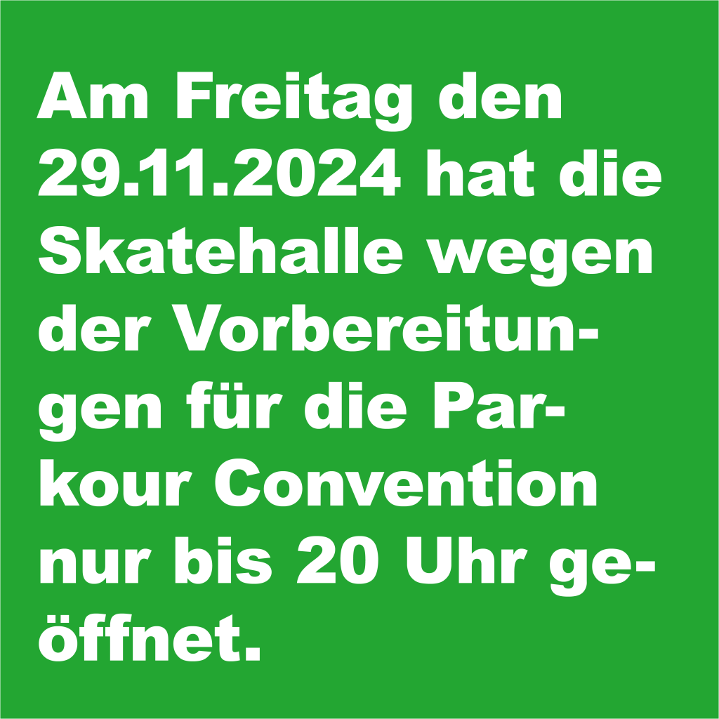 Wegen der am 29.11.2025 stattfindenden Parkour-Convention schließen wir die Halle am Freitag den 28.11.2025 bereits um 20 Uhr.